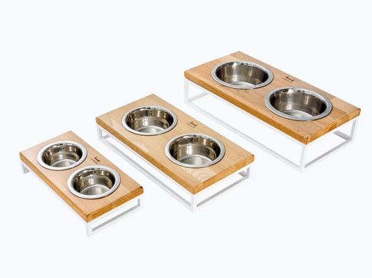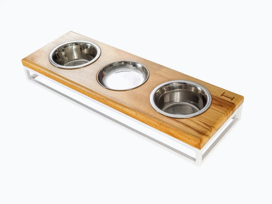 LUNCH BAR Katzennapf / Holz Napfständer mit drei Edelstahlnäpfen für Katzen / weißer Metallrahmen