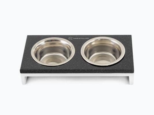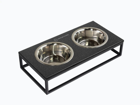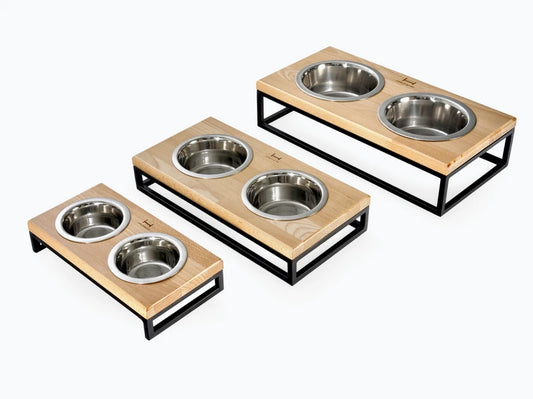 LUNCH BAR Katzennapf / Holz Napfständer mit zwei Edelstahlnäpfen für Katzen / schwarzer Metallrahmen