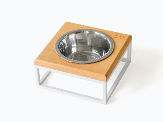 LUNCH BAR Katzennapf / Holz Napfständer mit einzelnem Edelstahlnapf für Katzen / weißer Metallrahmen