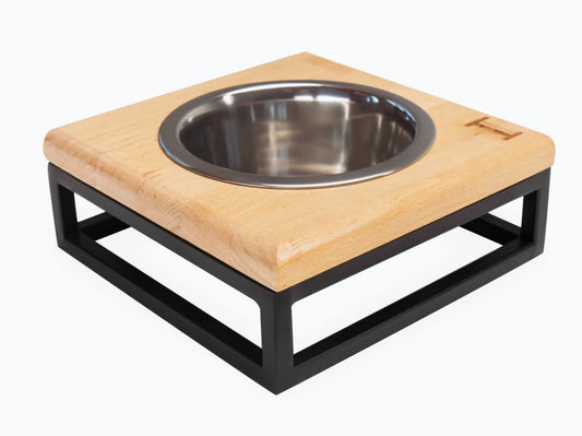 LUNCH BAR Katzennapf / Holz Napfständer mit einzelnem Edelstahlnapf für Katzen / schwarzer Metallrahmen