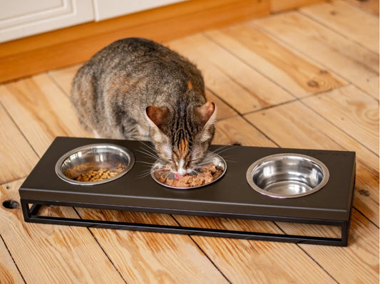 LUNCH BAR Katzennapf / Holz Napfständer mit drei Edelstahlnäpfen für Katzen / schwarzer Metallrahmen
