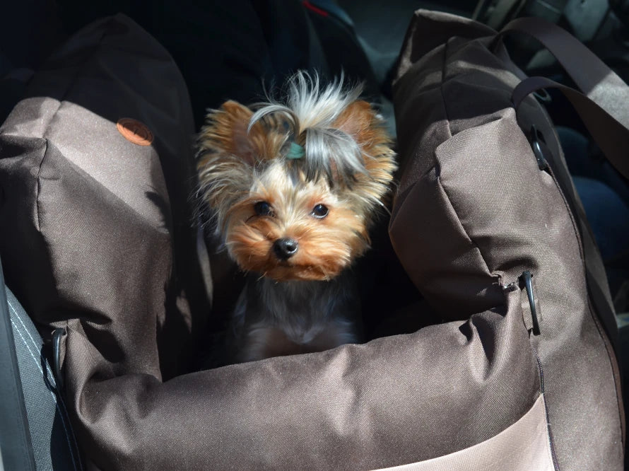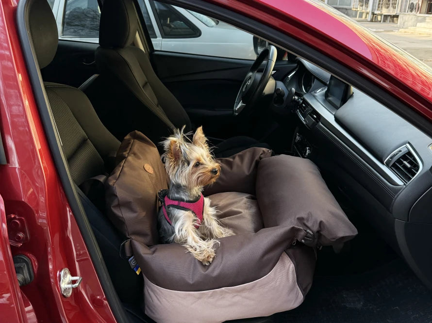 Der Sitz wird mit einem Sicherheitsgurt sicher im Auto befestigt, und der Hund wird mit einer Leine im Sitz fixiert. Die Ergonomie des Sitzes ermöglicht es Ihrem Hund, sitzend und liegend zu reisen (in jeder bequemen Position).