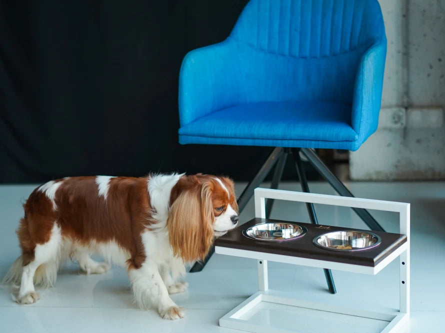 The stand is adjustable to the dog's height, providing a comfortable position for the dog during feeding.